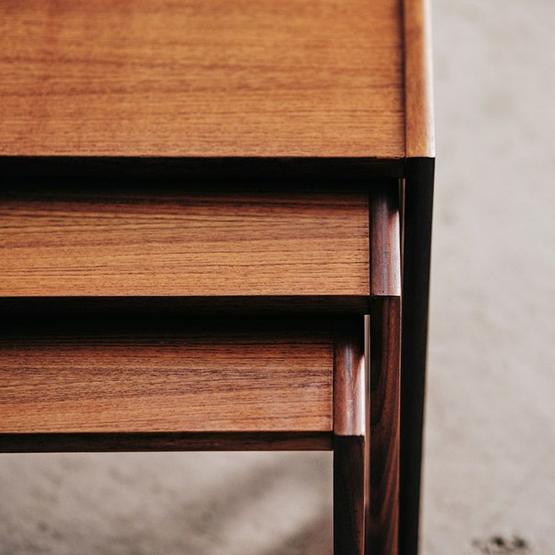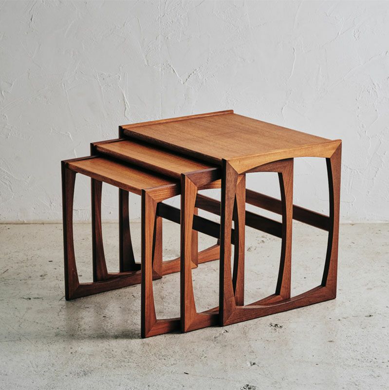 1960年代イギリスG-Plan社 ネスト オブ テーブル。 味わいのあるチークの色合いが 絶妙なコントラストを生み出しています。 無駄を省いたすっきりとしたミニマムデザインです。 北欧デザインを取り入れたシンプルでモダンなデザインは 様々なインテリアに溶け込み、末永くお使い頂けます。 ~ネストテーブルとは~ 同素材、統一されたデザインで大きさが少しずつ違う小型のテーブルを 入れ子にして重ねて置けるようにしたものを言います。 小さなテーブルを使わないときは、一番大きなテーブルの下に 納めておけるので、収納の場所をとりません。 3台ひと組みにしたものが一般的です。 ~G-Plan(ジープラン)~ デザイン性に優れ、英国のミッドセンチュリーを象徴するプロダクトとして 根強い人気のG-PLAN。北欧系デザインの家具シリーズ「G-PLAN」は、 英国の家具メーカー・E..GOMME社のブランド名です。 英国で初めてスカンジナビアンスタイル(北欧デザイン)を取り入れ 1953年からスタートしたこのシリーズは、1960年にかけて英国で大流行しました。