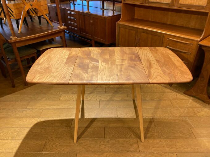 1960年代イギリスアーコール社のスクエアドロップリーフダイニングテーブル。 広げると(長方形)になるタイプです。 人数やお部屋の広さに合わせて大きさを変えられる機能的なテーブルです。 アーコールならではの柔らかさを感じるフォルム。 独自の技術で作り出された薄くすっきりとした天板にスラリと伸びた長い脚。 シンプルなデザインの中に技術とこだわりが詰まったアーコールのテーブルは 使い込むほどに味わいが増し、飽きることなく末永くお使い頂ける逸品です。 ~Ercol(アーコール)~ 1920年、家具デザイナーだったルシアン・アーコラーニが会社を設立。 スチームで湾曲させるウィンザーチェアの製造技術を完成させたほか、 ニレ材を自由自在に変形させる事も実現しました。 シンプルなデザインながら、木の家具ならではの温かみも併せ持った家具です。 50年代のモダニズムに影響を受けてデザインされているので、 現代家具と合わせやすいのも特徴です。