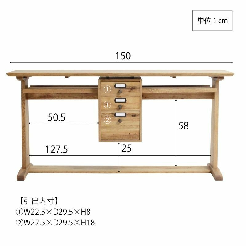 ●奥行き42cmのスリム設計ながら、幅150cmのゆったりとした天板が特長のデスクです。リビングでのパソコン作業やリビング学習にぴったりの木製デスクです。