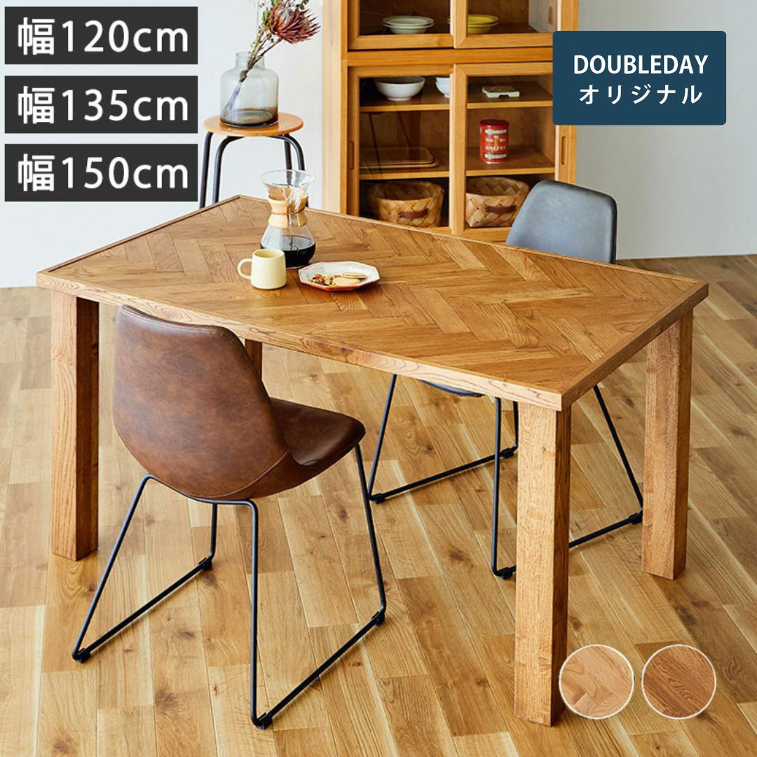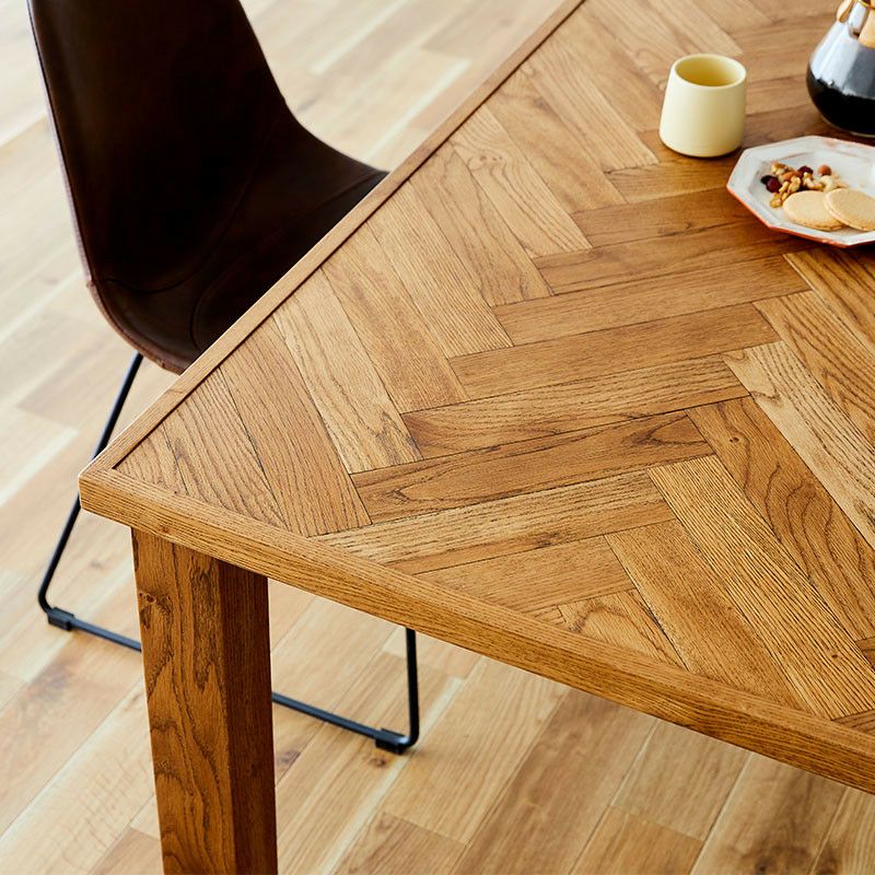 ヘリンボーンに組み込まれた天板が印象的な日本製ダイニングテーブル「NANCY (ナンシー) 幅120cm/幅135cm/幅150cm」です。ダブルデイオリジナルデザインです。NANCYは、全28種類のサイズから選べます。
