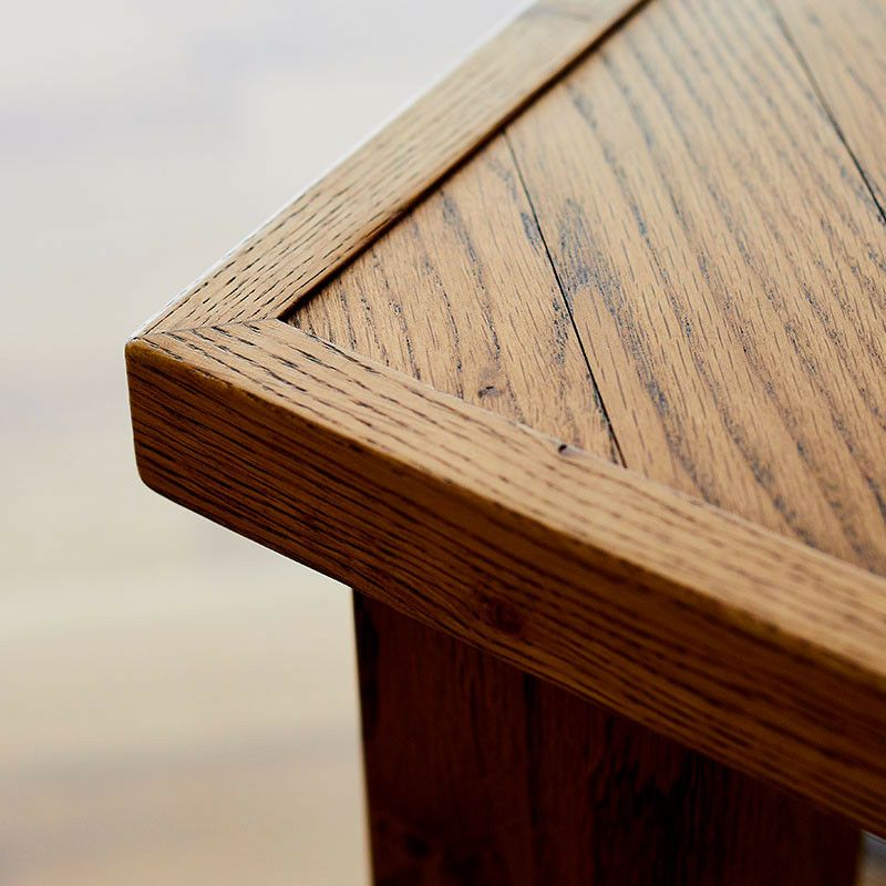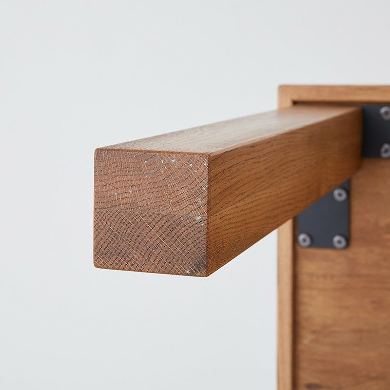 天板には北海道産のナラ材を使用しています。細かく、美しい木目が特徴で、近年は入手困難になりつつある希少素材です。 経年変化を楽しめるのも大きな魅力です。使いこむほどに味わい深くなる天板は、メンテナンスを繰り返すことによってお客さまだけの1枚に仕上がります。