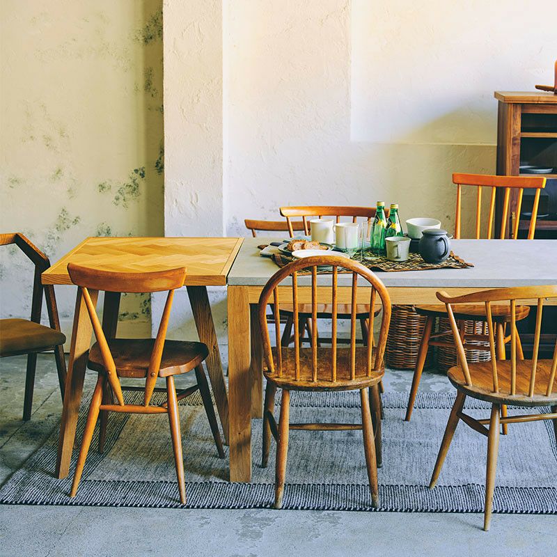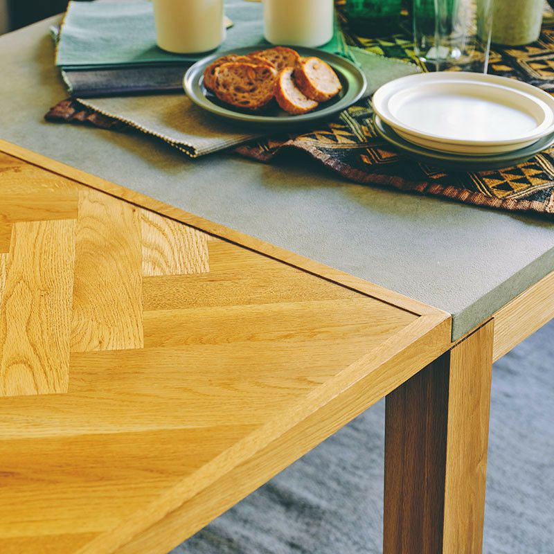 PATNAモルタル調天板ダイニングテーブル(奥行き80cm)とであれば、段差が発生せず一体感があります。ヘリンボーン天板とモルタル調の贅沢でクールな組み合わせをお楽しみいただけます。