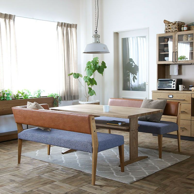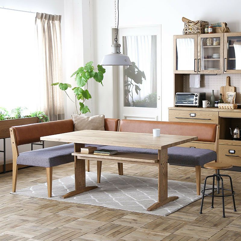 ▼ダイニングテーブル(幅150cm)、ベンチ(片肘)、ベンチ(肘無し)(ベンチをL字にレイアウト)