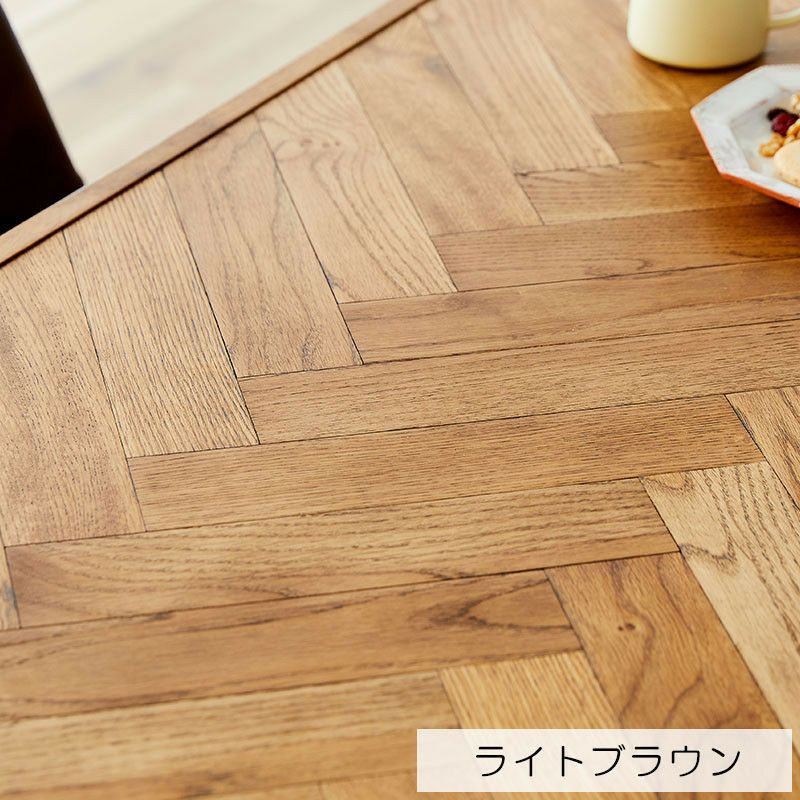NANCYは、天然木をふんだんに使った優しい印象のテーブルです。 極力シンプルなデザインにすることで天板のヘリンボーンを際立たせています。天然木で組み合わせたヘリンボーン柄の家具は特別なものとしてインテリアを引き立てます。