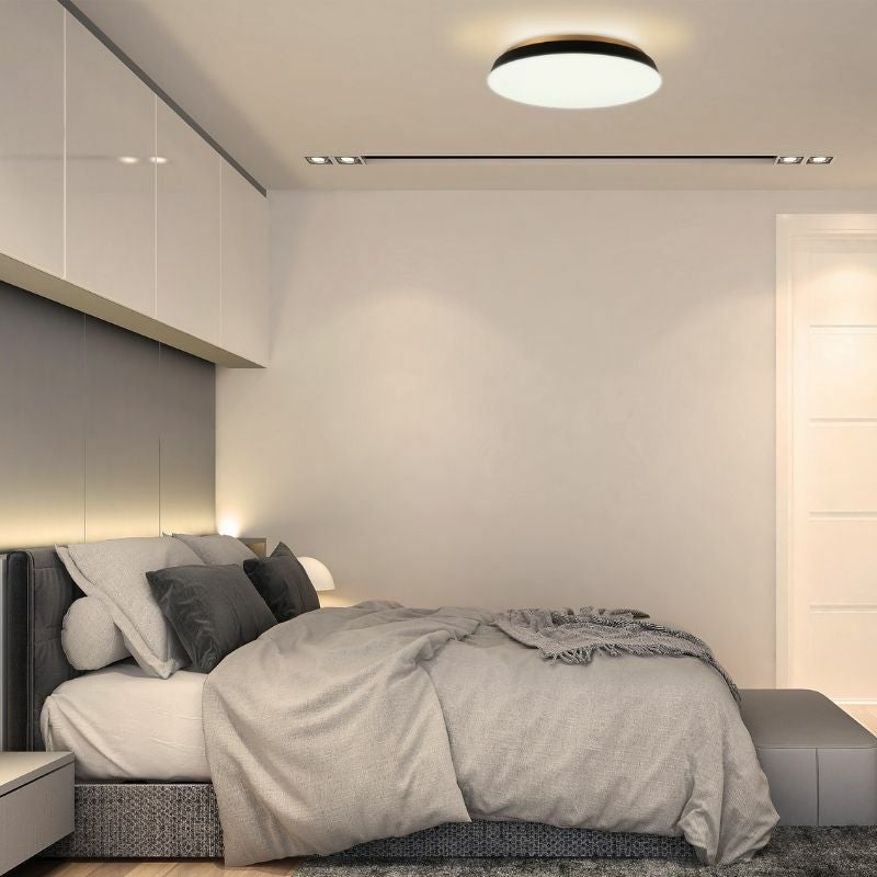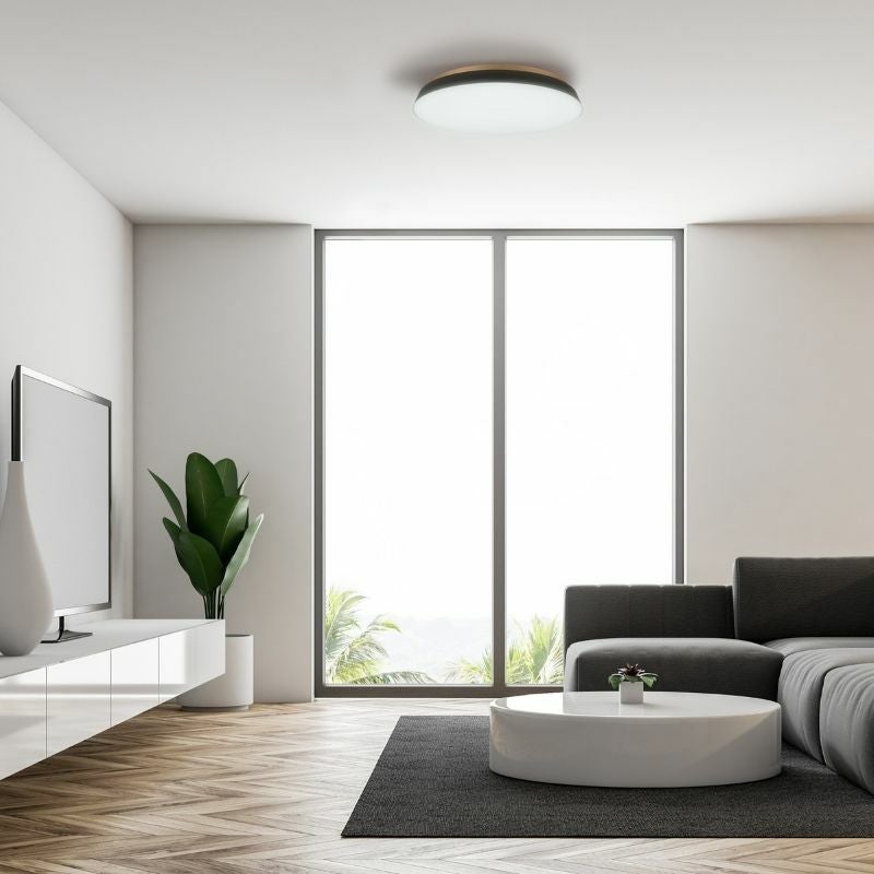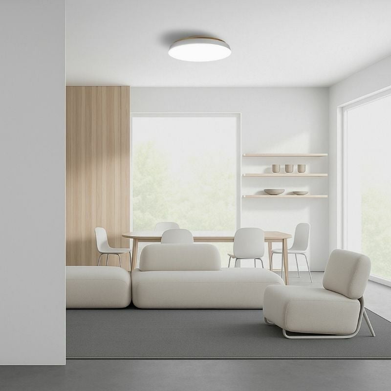 余計な装飾を削ぎ落とした、フラットで端正なかたちが印象的です。天井と一体化するように馴染みながら、中央のゴールドがさりげなく空間を引き締めます。 インテリアに自然と調和するデザインです。