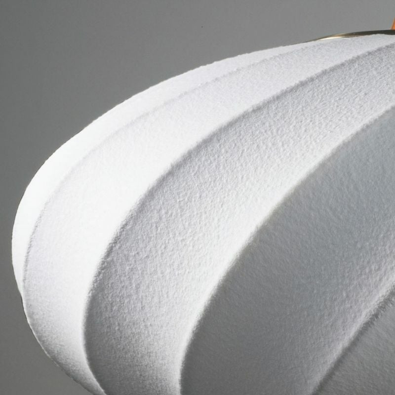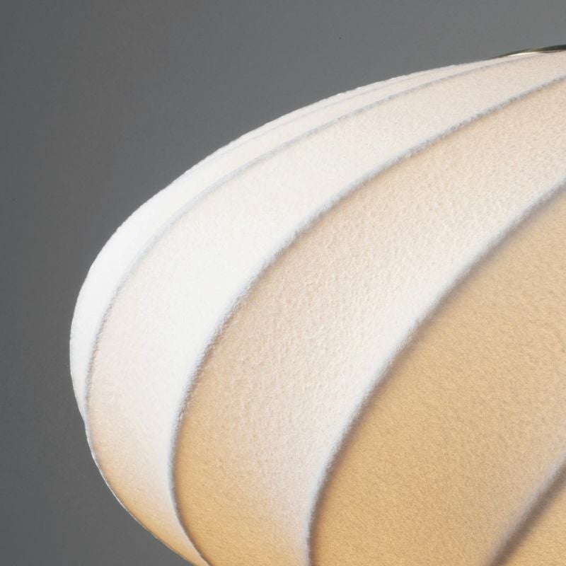 シェードは、細いワイヤ―フレームによって、流れるような螺旋模様が描かれたオーバル形状に仕上がっています。 表面にはファイバーがスプレーで吹きつけて作られているので画一的になりすぎず、和紙のような表情を持っています。