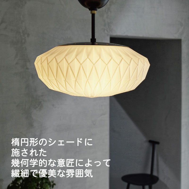 楕円形のガラスシェード全体に、幾何学模様のような凹凸が施されています。 上品なフォルムと規則的な意匠によって繊細で優美な雰囲気を持っています。