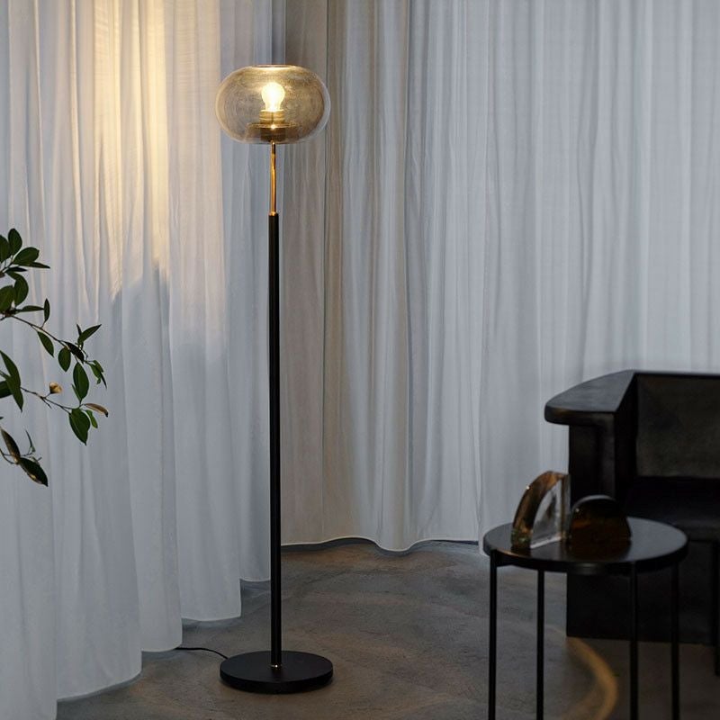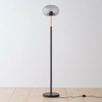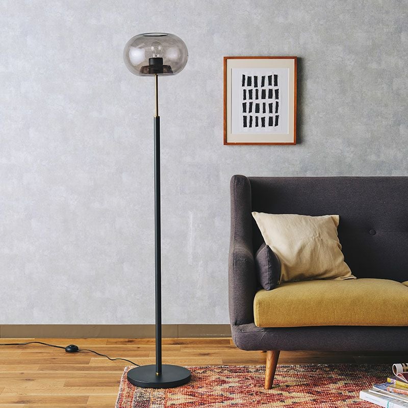 スモーキーグレーのガラスシェードと直線的な支柱の組み合わせがスタイリッシュなフロアランプ「Merander(メランデル)」です。
