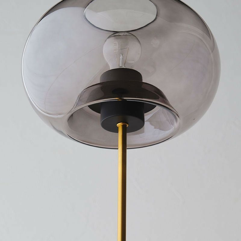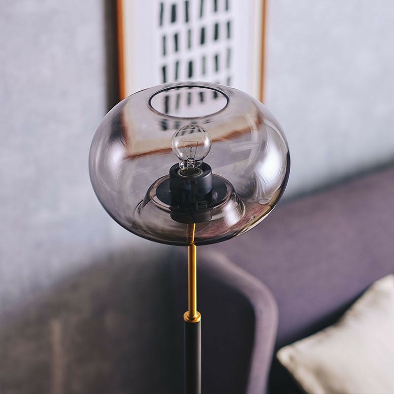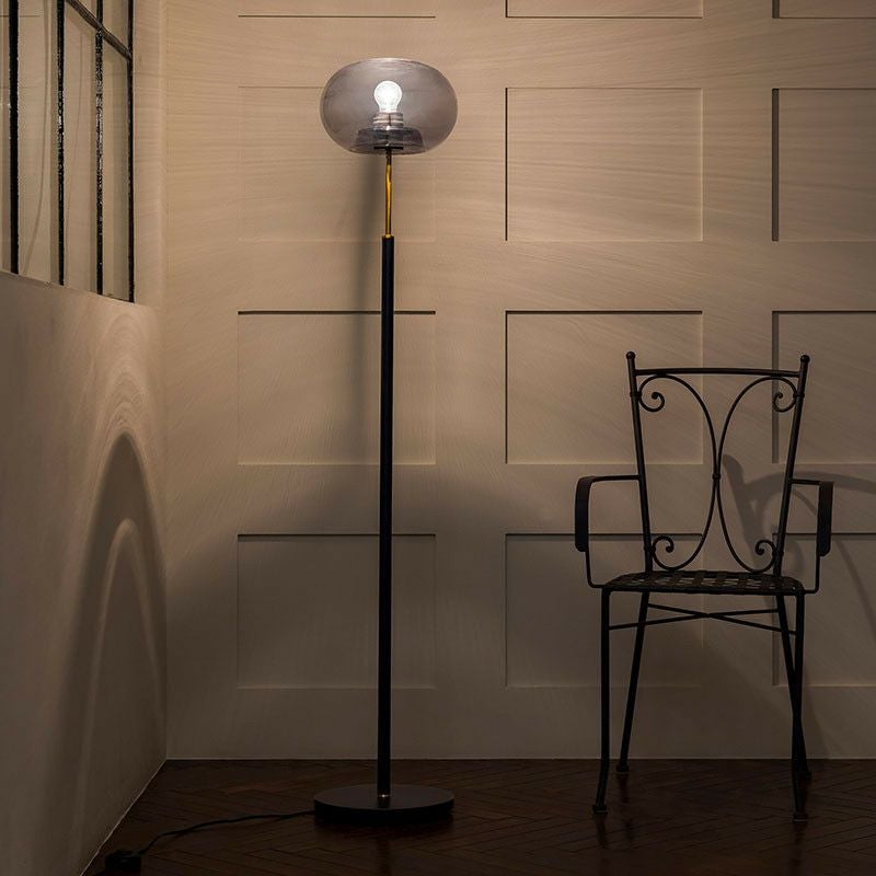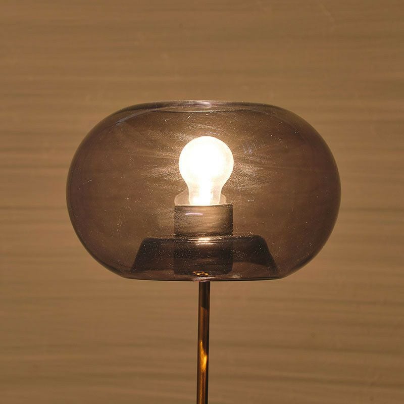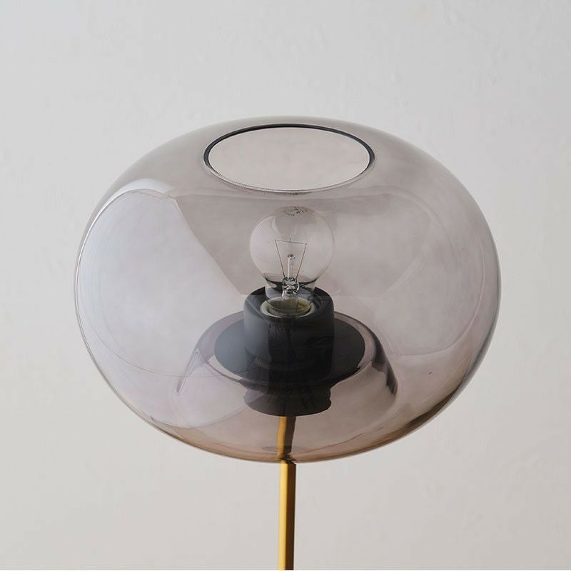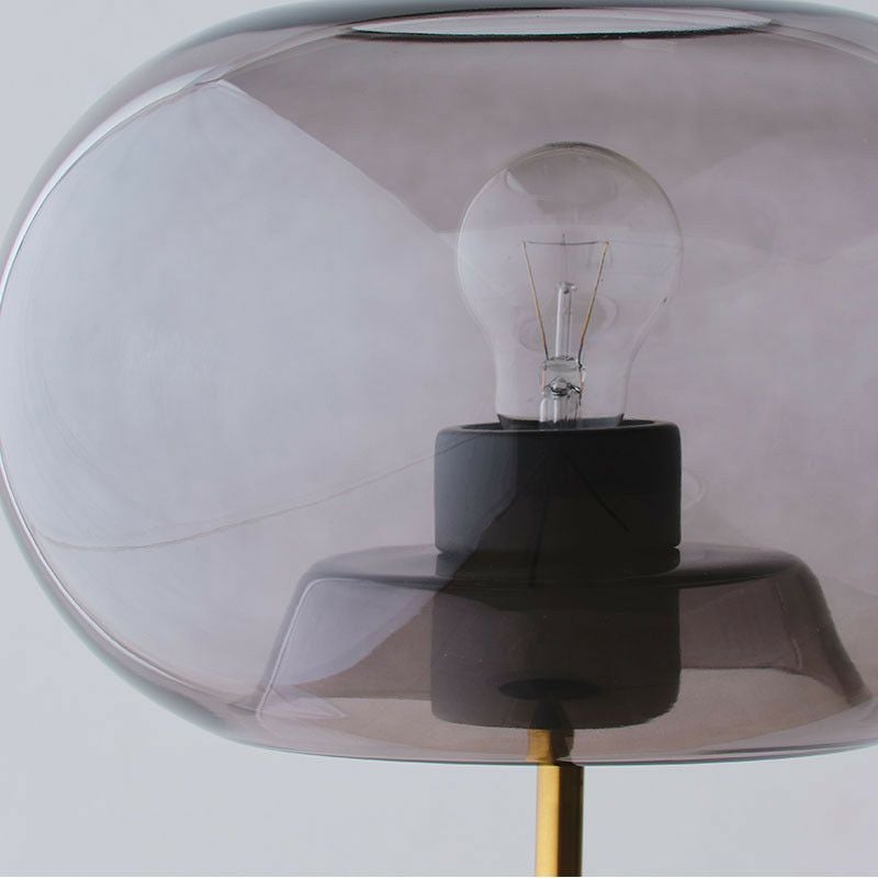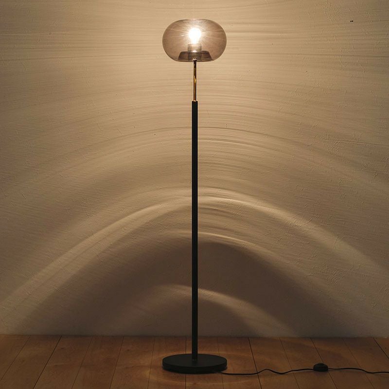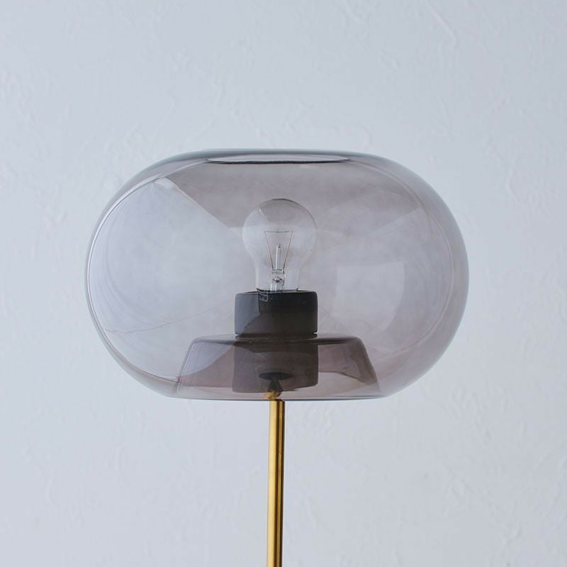 落ち着いた色合いのグレーガラスを使ったオーバル形状のシェードと、支柱などにあしらわれたゴールドの組み合わせが都会的な印象です。ミニマルデザインの支柱はモダンなインテリアにも好相性です。