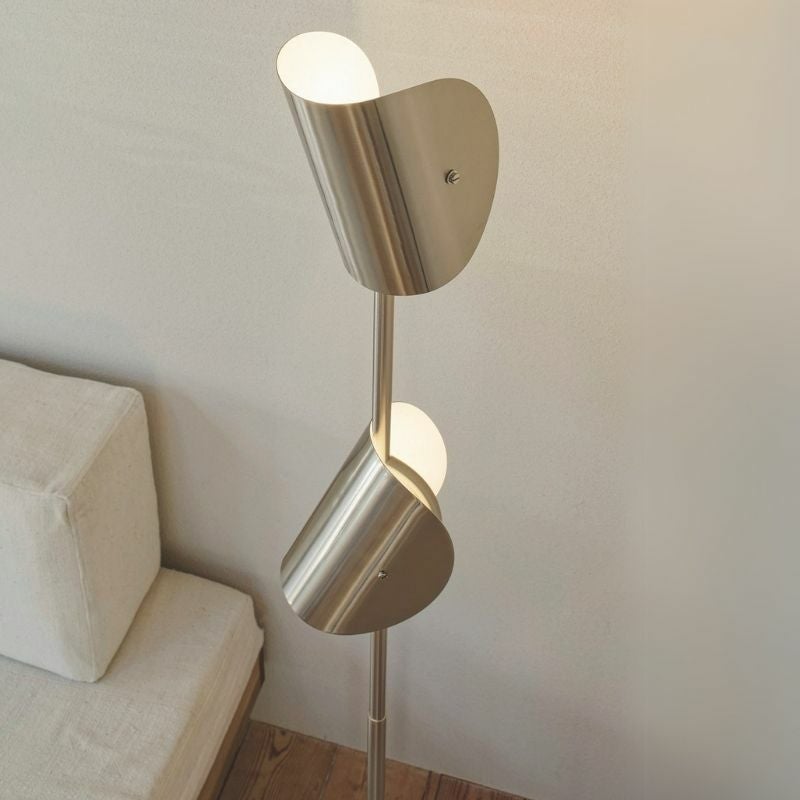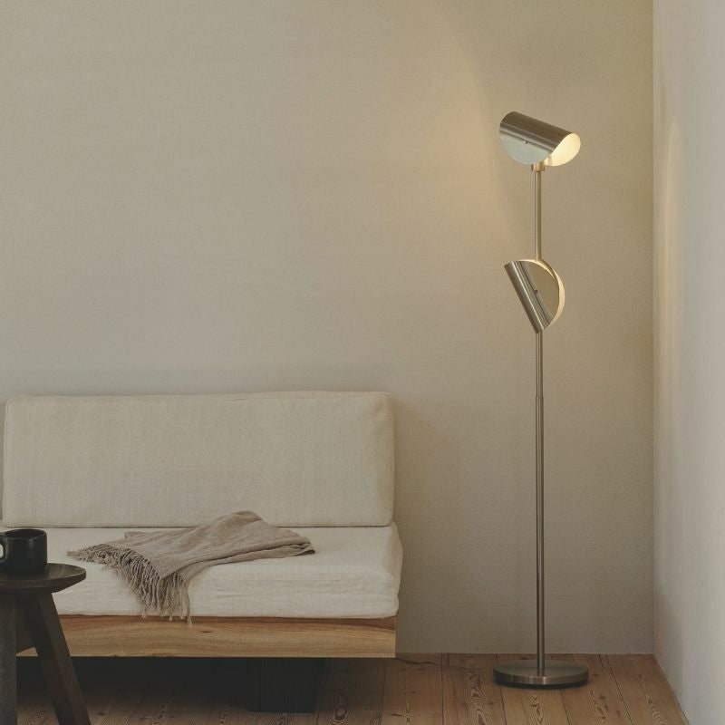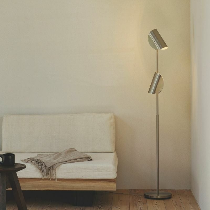 まっすぐ伸びたシンプルな支柱に上下2灯のシェードが配されています。 半円形のシェードから広がる光が重なりながら流線型の陰影を生み、幻想的な雰囲気を演出します。