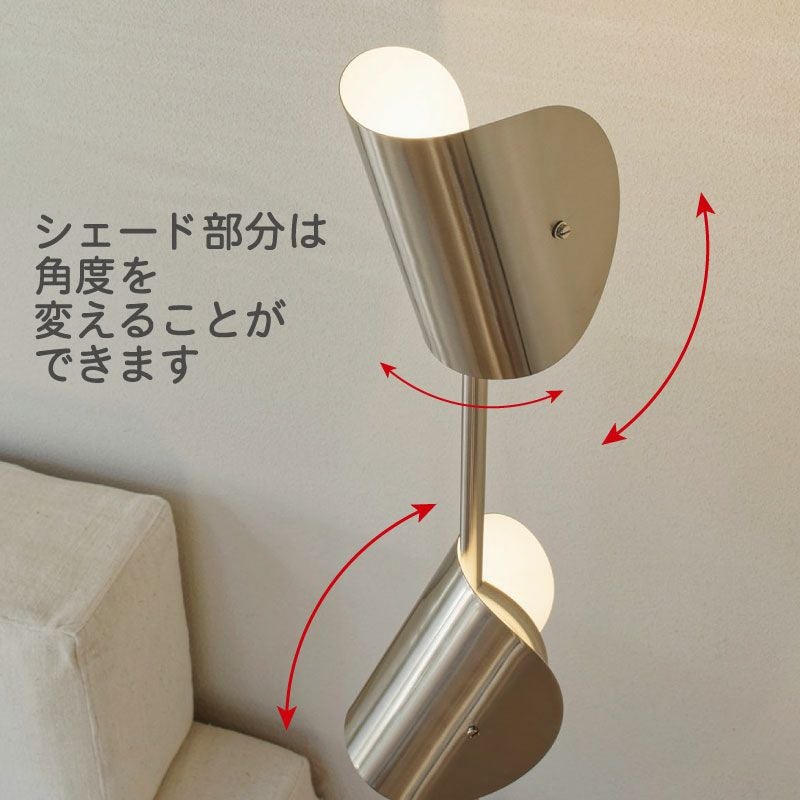 シェードは動かせるので好みの角度の調節可能です。上のライトは壁や天井に明かりを広げながら下のライトで手元を照らして読書灯にするなど、 間接照明としての実用性も高いランプです。