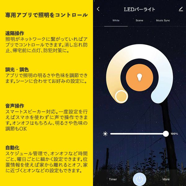 機能 調光/調色、メモリー機能/タイマー機能(ON・OFF/1時間単位、最大12時間まで)、リラックスモード、読書モード