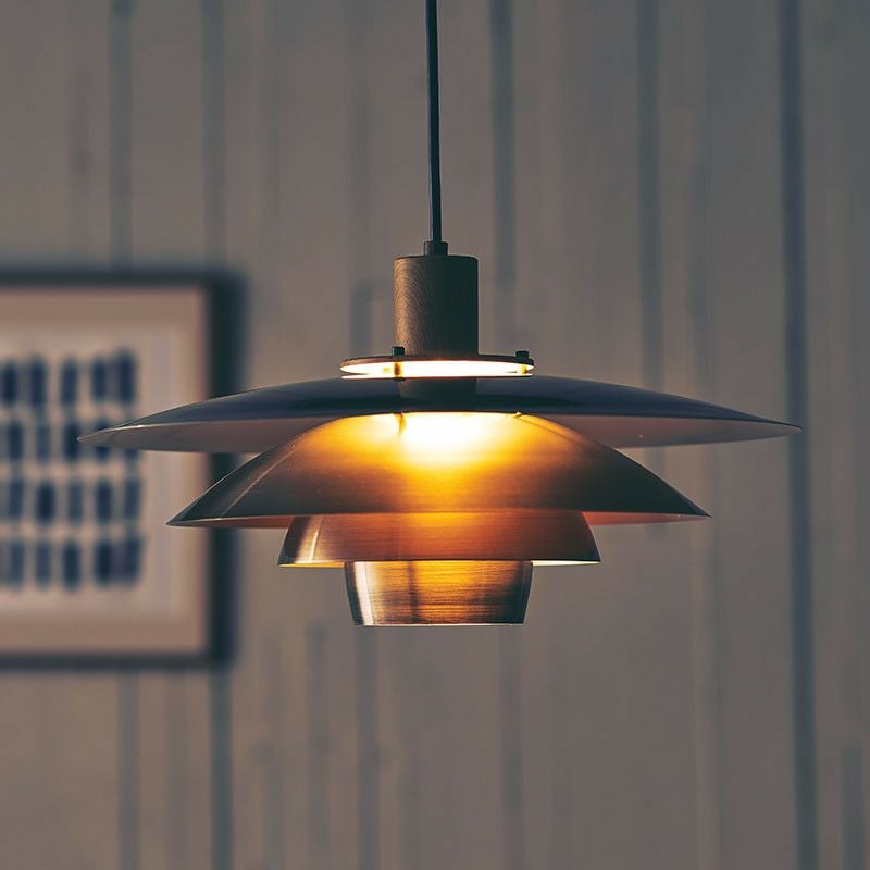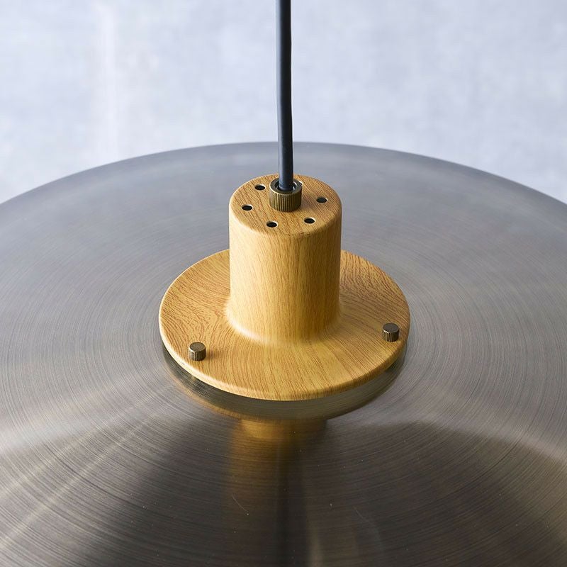 真鍮色のようなゴールドのシェードはヘアライン加工を施し、上品で落ち着いた印象に仕上げています。シンプルながらも存在感を放ち、消灯していても程よいアクセントになります。