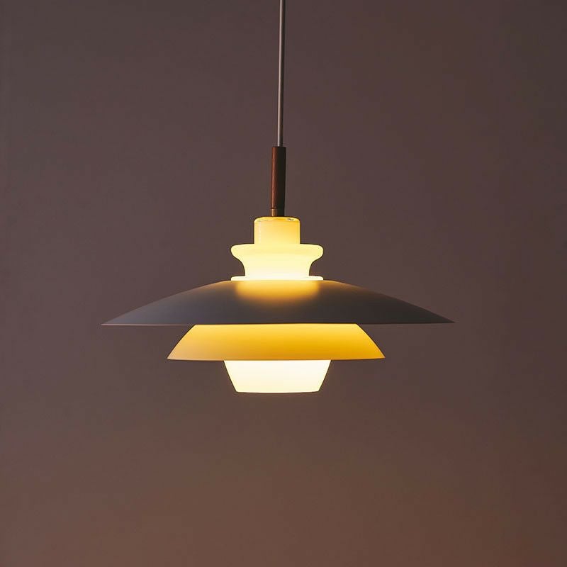 点灯すると、外側の傘に柔らかな光が拡がる様子がよくわかります。乳白色のガラスから柔らかな光が拡散します。グレアフリーを意識したデザインです。