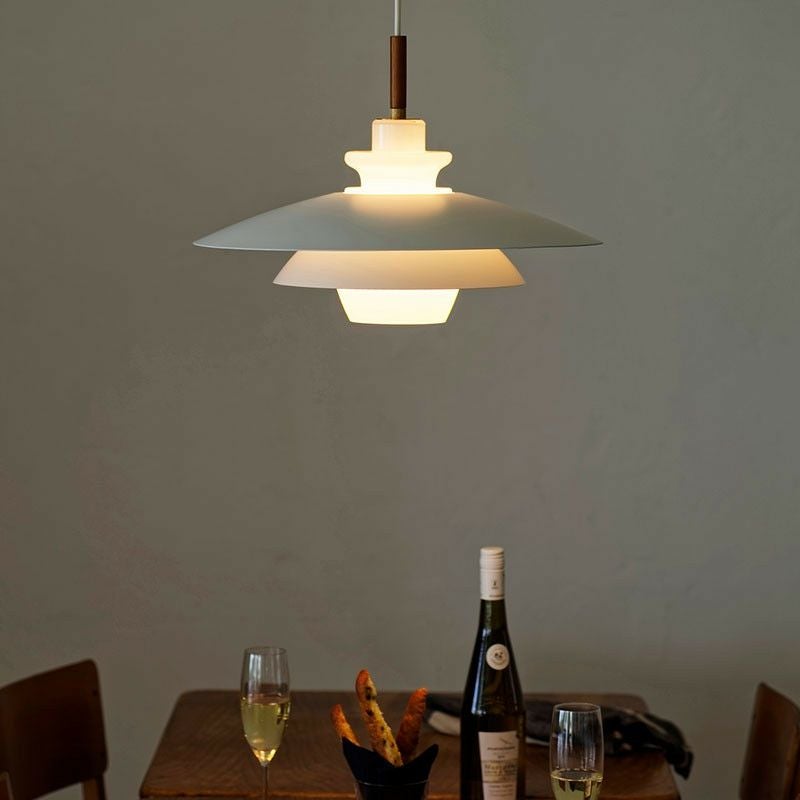 Blancheは異なる素材を組み合わせて構成しています。外側と内側の傘部分はアルミ、電球を覆うシェードはガラスを使用しています。乳白色のガラスから漏れる光とアルミを組み合わせることで美しい光のグラデーションが生まれます。