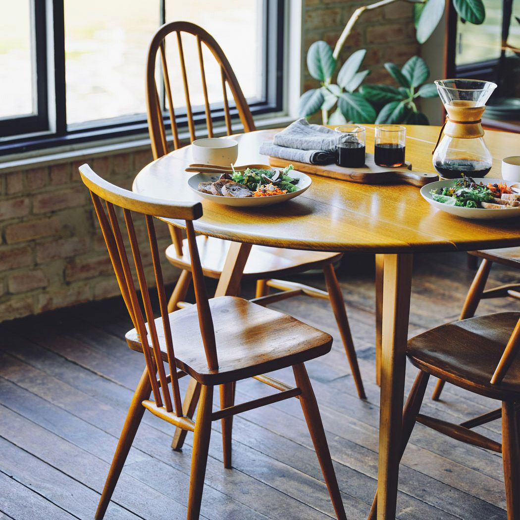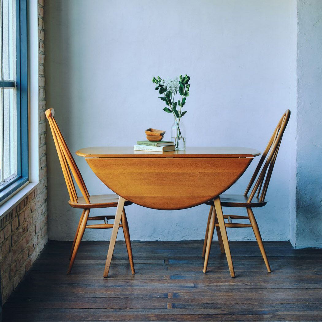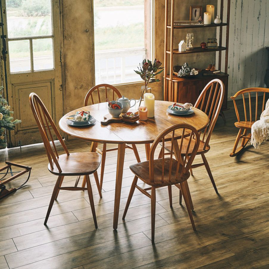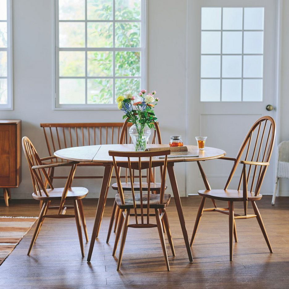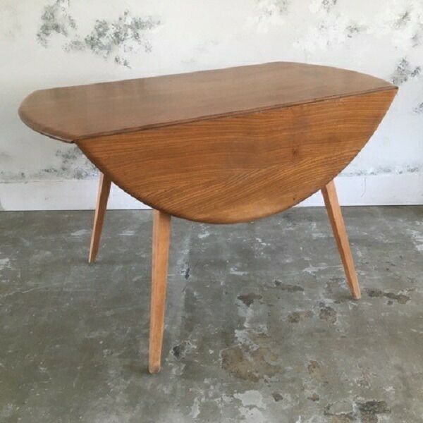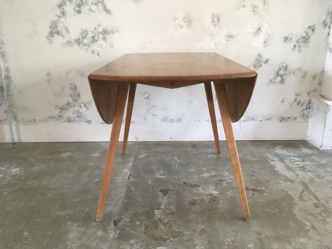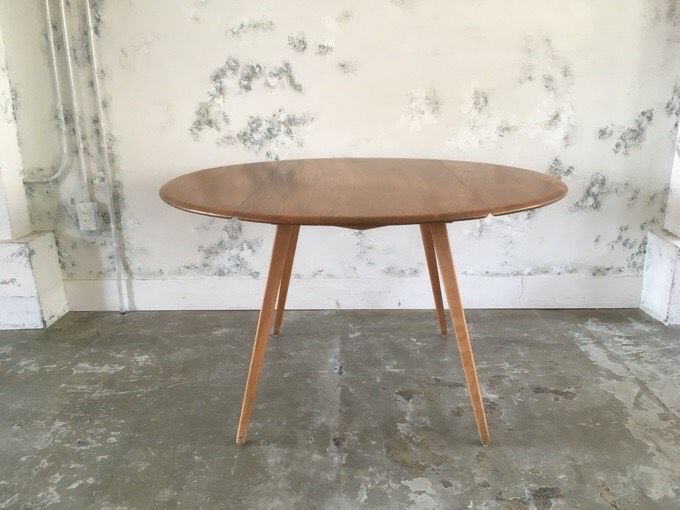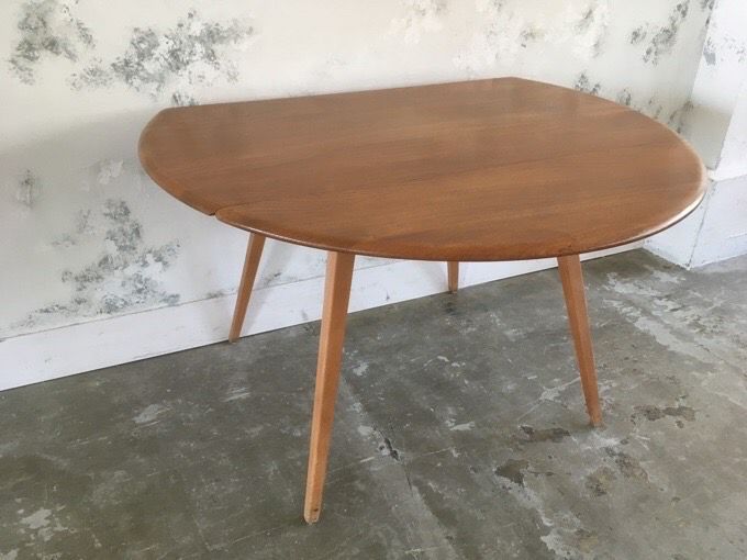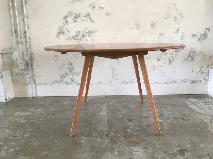 1960年代イギリスアーコール社のドロップリーフダイニングテーブル。 広げるとオーバル(楕円形)になるタイプです。 人数やお部屋の広さに合わせて大きさを変えられる機能的なテーブルです。 アーコールならではの柔らかさを感じる丸みを帯びたフォルム。 独自の技術で作り出された薄くすっきりとした天板にスラリと伸びた長い脚。 シンプルなデザインの中に技術とこだわりが詰まったアーコールのテーブルは 使い込むほどに味わいが増し、飽きることなく末永くお使い頂ける逸品です。 ~Ercol(アーコール)~ 1920年、家具デザイナーだったルシアン・アーコラーニが会社を設立。 スチームで湾曲させるウィンザーチェアの製造技術を完成させたほか、 ニレ材を自由自在に変形させる事も実現しました。 シンプルなデザインながら、木の家具ならではの温かみも併せ持った家具です。 50年代のモダニズムに影響を受けてデザインされているので、 現代家具と合わせやすいのも特徴です。