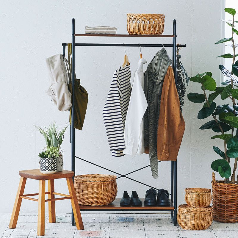 あたたかみを感じるウォールナットと、マットなブラックスチールの組み合わせがインダストリアルな雰囲気を演出。クローゼットの中だけでなく、室内で見せる収納を楽しむこともできます。