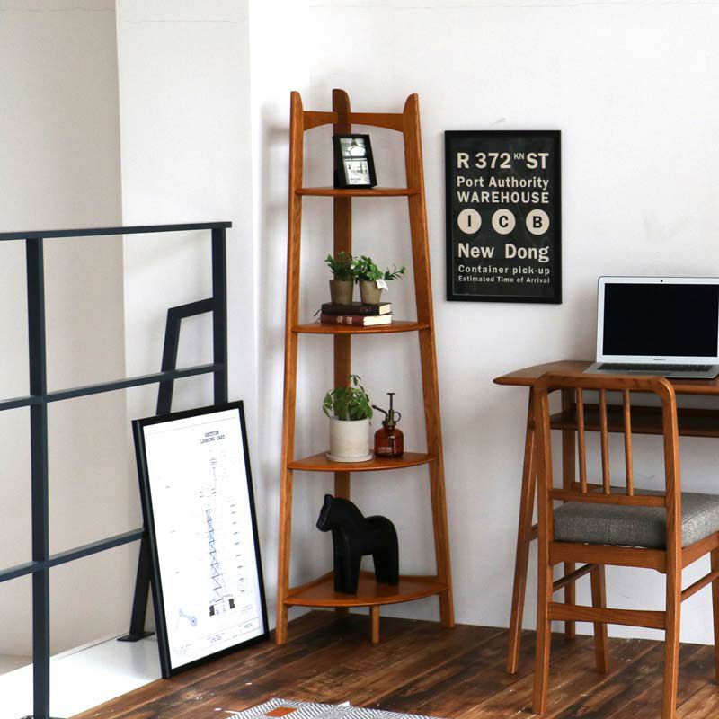 狭いスペースの隅を有効活用できるサイズとデザインです。観葉植物やインテリアグッズの飾り棚としてや、ちょっとした収納棚として便利に使えます。