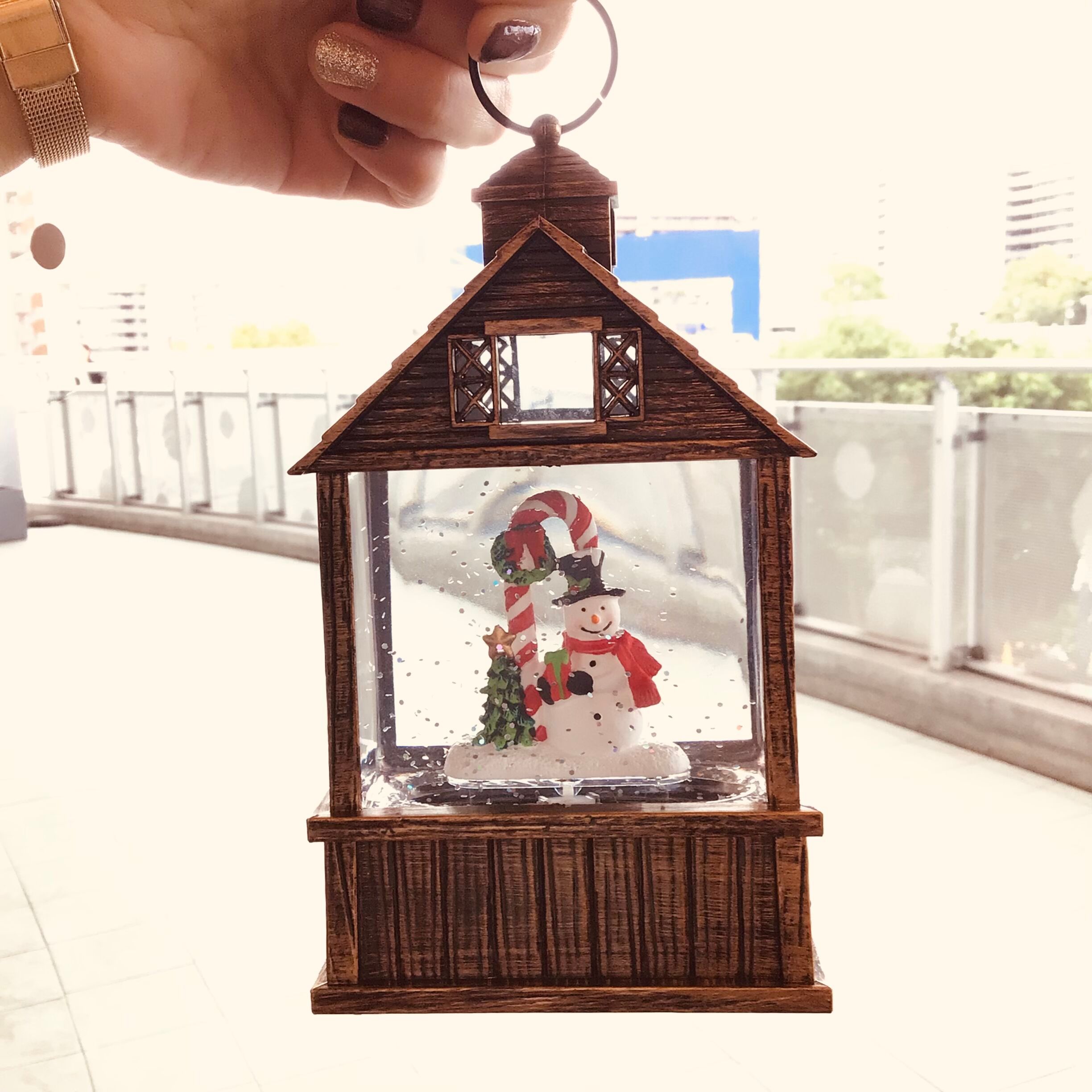 華やかに雪が舞い続ける自動スノードームです。